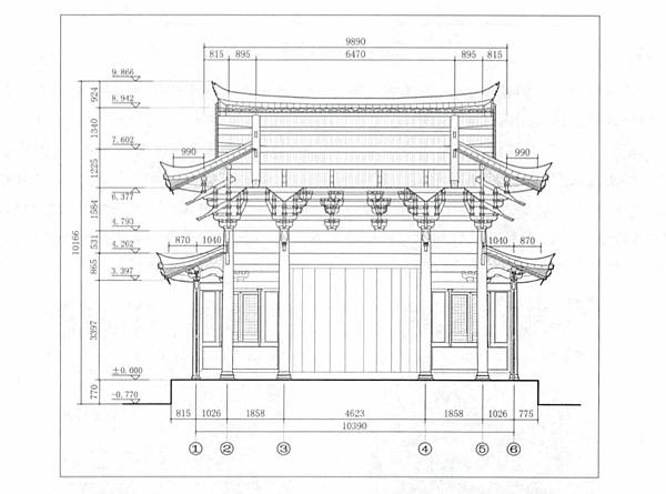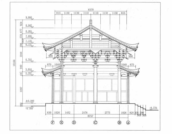 時思寺大殿面闊三間,進深二間,重檐歇山頂。正殿上方有長八角形藻井。 [1]