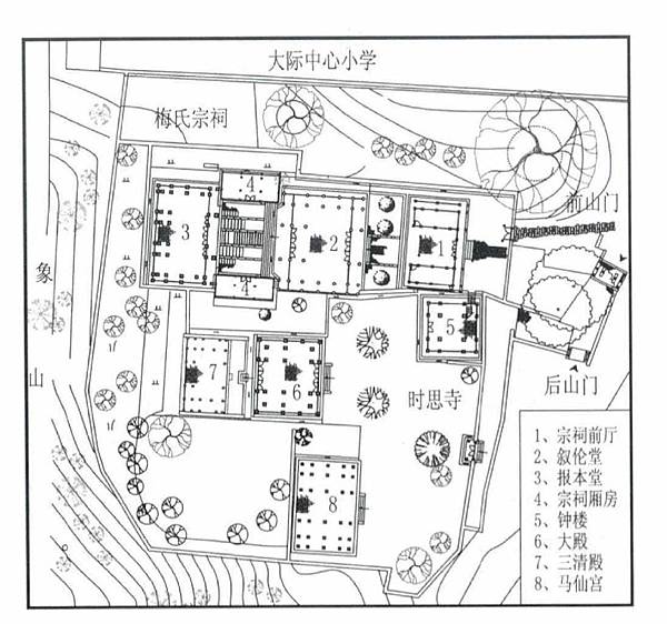 時思寺始建於元至正十六年(1356年),明末清初續建。平面近長方形,南北長66米,東西寬57米,由山門、鐘樓、大殿、三清殿、馬仙宮、梅氏宗祠等建築組成,建築面積1250平方米