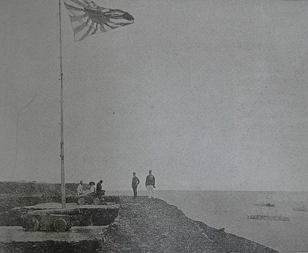 日軍於1895年3月25日佔領澎湖漁翁島後升旗,翻拍自《攻臺圖錄》。