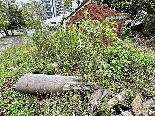 新竹縣議員蔡蕥鍹痛批,竹北高鐵特區文興國中基地內的清河堂三合院,在文化局解除列冊後,竟淪為民眾丟棄垃圾、雜草叢生的廢墟。(記者廖雪茹攝)