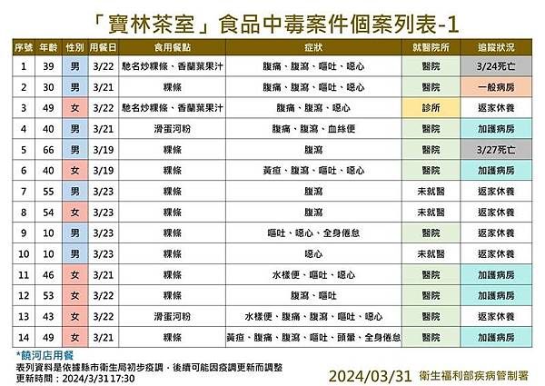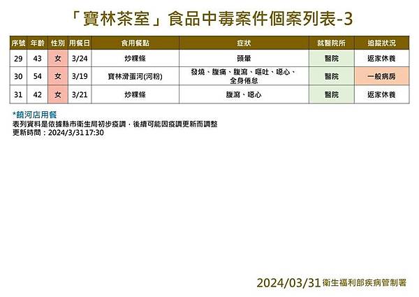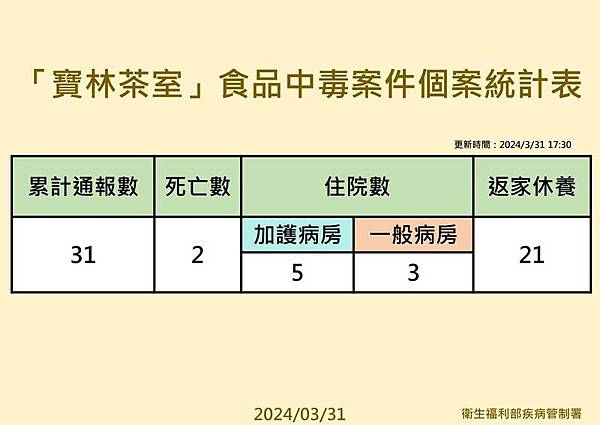 根據疾管署最新統計,截至今日下午5點半,寶林茶室食品中毒案累計通報達到31例,包含2例死亡、5名加護病房、3名一般病房,以及21名返家休養。
