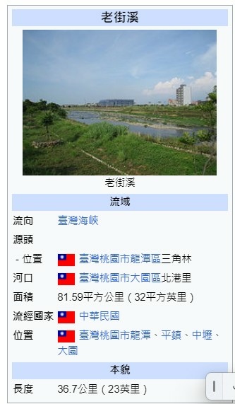 老街溪位於中華民國桃園市,因經流中壢老街(聚落名)而得名。全長36.7公里,起源於龍潭區,流經龍潭、平鎮、中壢、大園四區,流域面積大約八十二平方公里。 老街溪 - 維基百科,自由的百科全書