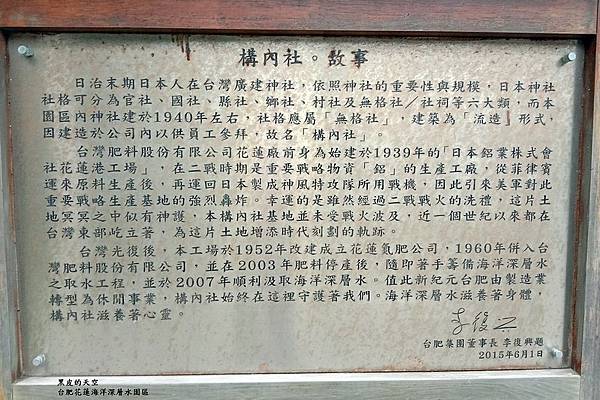 拍完台肥構內社才注意到此園區被日式古蹟房舍環繞著,還有二次大戰的產物海角防空洞,了解到台灣海礦館前身是日本鋁株式會社的工廠,曾在日治期間,生產鋁錠提供日本航太產業使用,也因此成為美軍轟炸的目標受損慘重。廠區內計有十二處防空洞及神社;戰後該工廠由台灣肥料有限公司繼承後,直到1990年代前均作為作為肥料工廠使用,1990年代開始隨者國營事業的民營化,台肥在民營化的過程也開始多角化經營,其中花蓮工廠為了開發海洋深層水,也轉型成為觀光工廠,現為台灣海礦館,並增建可以泡腳的「深足癒步道」,還有「遇見花池」等觀光設施;在學者專家的建議下將該神社重建復原,據稱為台灣第一個重建復原的構內社,有復原後的鳥居與拜殿。【花蓮市】台灣海礦館/台肥構內社 @ 黑皮的天空 :: 痞客邦 :: https://bit.ly/49NduWZ