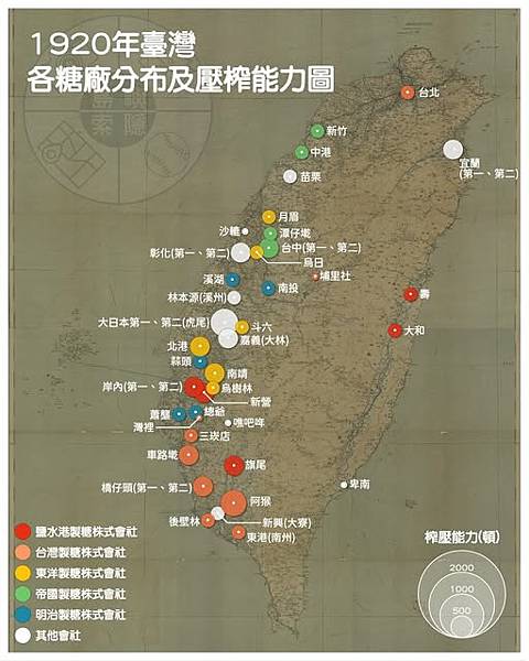 1920年台灣各糖廠分布與壓榨能力泡泡圖