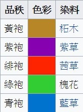 公服官服顏色+朝服,朝廷之服;五等,朱、紫、緋、綠、青/朱、紫、緋、綠、青五種/三品以上服紫,五品以上服緋,七品以上服綠,九品以上服青 @ 姜朝鳳宗族 :: 痞客邦 ::