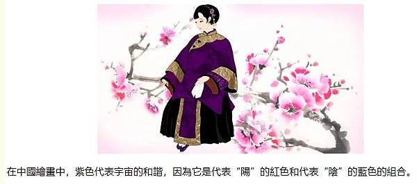在中國繪畫中,紫色代表宇宙的和諧,因為它是代表“陽”的紅色和代表“陰”的藍色的組合。