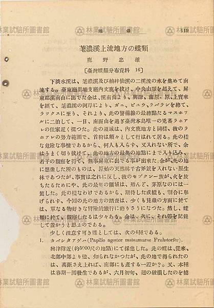 鹿野忠雄到荖濃溪實地觀察後,在臺灣博物學會會報上發表的論文,展現他對昆蟲的偏愛。
