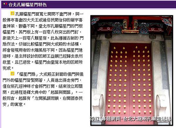 「櫺星門扇」大成殿正對面的儀門與儀門外的櫺星門皆緊閉著,人員進出得走旁門,僅在祭孔迎神時才會將門打開,結束後立即關閉,此過程是釋大典中的「起扉與閤扉」。一般而言,起扉有「左開風調雨順,右開國泰民安」的寓意。台北大龍峒-孔廟走透透 http://tinyurl.com/yxv4th3h