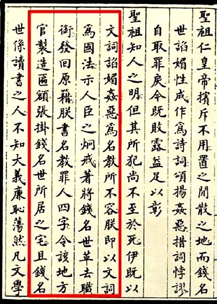 然而,對錢名世的處分還不止於此。雍正帝覺得,掛「名教罪人」的匾,只能把錢名世在他的老家搞臭,還不能充分發揮警戒大小臣的作用。於是,命在京現任官員,凡由舉人、進士出身的,都要仿照詩人刺惡之意,每人寫一首詩贈送錢名世,喜笑怒罵,冷嘲熱諷,越刻薄越好。正詹事陳萬策的詩兩句為:「名世已同名世罪,亮工不異亮工姦。」前一句是說錢名世與康熙晚年因著《南山集》而處斬的戴名世的同罪,後一句是從年羹堯與錢名世都表字亮工說二人同為姦邪之人。陳萬策的詩,無論內容或風格,都深得雍正帝的嘉許,在諸多諷刺錢名世的詩作中,被評為第一名。也有寫這詩而倒楣的。翰林院侍讀吳孝登的詩被認為「謬論」,遣發寧古塔,給披甲人為奴,所受懲罰比正犯錢名世還重。還有侍讀陳邦彥,陳邦直兄弟的詩也有問題而被革了職。這些刺錢之詩,按照雍正的諭旨很快刊刻付印了。據說是武英殿板,雕寫極工,宣紙印題曰《御製錢名世》。這本詩集在雍正朝各省學校都頒發一本,用以教訓準備入仕的讀書人。