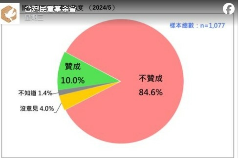 台灣民意基金會6日在臉書上PO出「國人對死刑存廢的態度」的文章指出,在他們詢問「國內死刑存廢問題最近再度成為社會關注焦點。一般說來,您贊不贊成 廢除死刑?」的結果發現,有4.9%的民眾「非常贊成」,有5.1%的民眾「還算贊成」,有21.3%的民眾「不太贊成」,有63.3%的民眾「一點也不贊成」,有4%民眾「沒意見」,另有1.4%的民眾「不知道」。