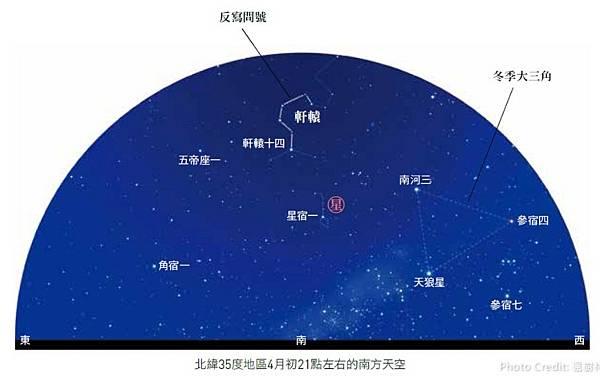 早春之夜,稍顯黯淡的群星中,一把巨大的鐮刀或者說一個反寫的問號正立於南天,這就是軒轅星官的主體。鐮刀下面最亮的一顆星恰好位於黃道之上,叫作軒轅十四,是西方黃道帶四大天王之一。找到了軒轅十四,我們便可以很容易地找到其下方一顆孤零零的橙紅色亮星,它是周圍大片天區中唯一的亮星,因此阿拉伯人稱之為Alphard,意思是「孤獨者」。它的中國名字叫星宿一,古人將它與周圍六顆小星一起組成一個星官,稱為「七星」,也就是二十八宿之一的星宿。