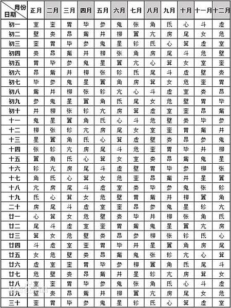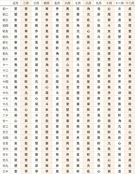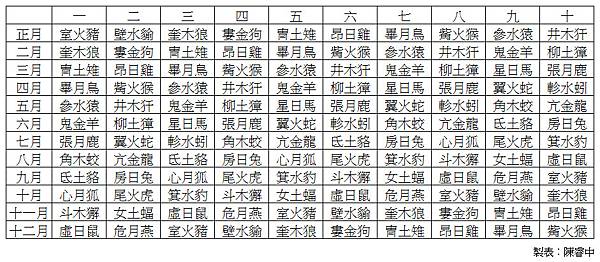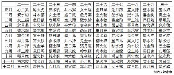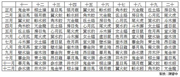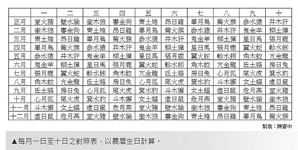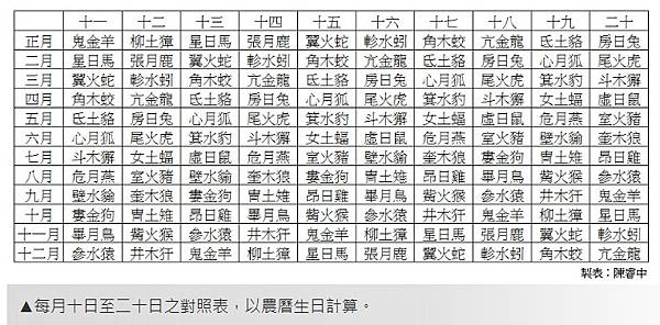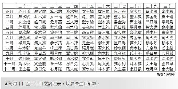 ▲每月十日至二十日之對照表,以農曆生日計算。