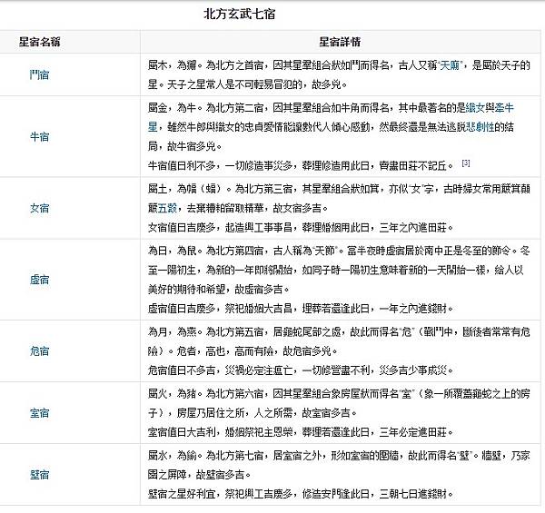屬水,為獬。為北方之首宿,因其星群組合狀如斗而得名,古人又稱“天廟”,是屬於天子的星。天子之星常人是不可輕易冒犯的,故多兇。