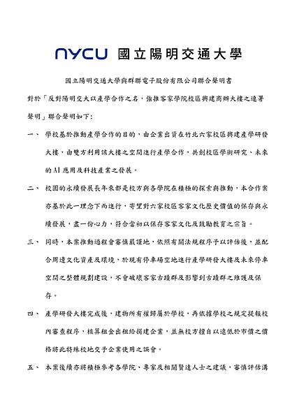 群聯於聲明中表示,關於計畫無償捐建陽明交大竹北六家校區產學合作大樓乙案,公司近日來已接獲來自各界的建議與關心,亦考量陽明交大於未達成共識前不再續行推進行政作業,本公司為此表達充分理解與尊重,並自即日起相應中止該捐建案後續作業。