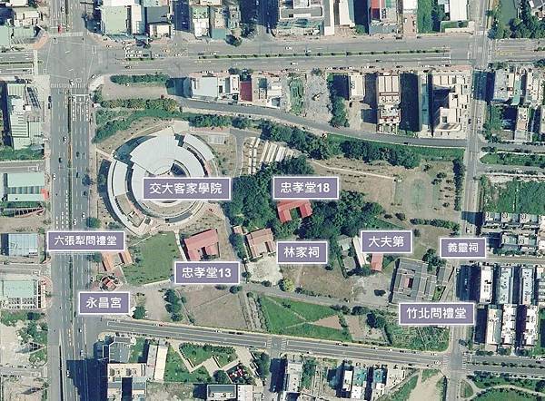 竹北六家老屋聚落古蹟群的大夫第,照片右上角的位置,陽明交大計畫給企業蓋商辦。莊勝鴻攝