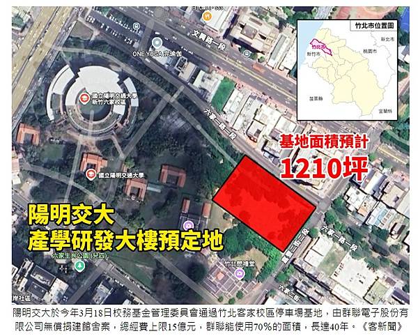 明交大於今年3月18日校務基金管理委員會通過「竹北客家校區停車場基地,由群聯電子股份有限公司無償捐建館舍案」總經費上限15億元,群聯能使用70%的面積,長達40年。