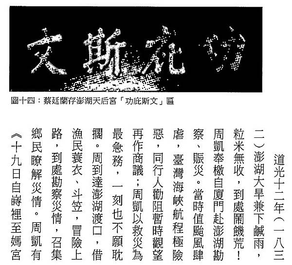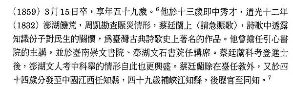 「1801 年,蔡廷蘭出生在澎湖馬公的一個書香世家......1835 年,蔡廷蘭與弟弟蔡廷揚一同前往福建參加鄉試,但卻雙雙落榜,名落孫山的蔡廷蘭只能摸摸鼻子返回澎湖,然而,這一次的返鄉之途並不順利,因為,他遇到了颱風」