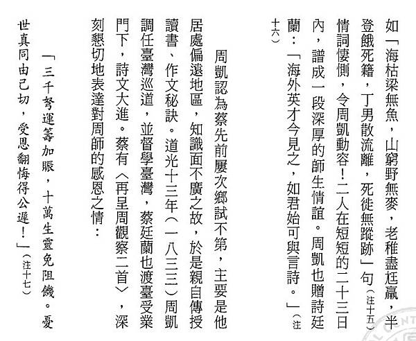 在台灣進士裏,蔡廷蘭算是大器晚成的人物,中進士時已經45歲了。實際上,蔡廷蘭成名頗早。1831年,澎湖遭受風灾,蔡廷蘭以《請急賑歌》受知於來澎勘賑的泉永道周蕓皋,《請急賑歌》成爲名篇。1835年,蔡廷蘭渡海應福建鄉試(俗稱考舉人)報罷,歸途遇風,隨船漂浮至於越南。蔡廷蘭就其歷險過程寫爲《海南雜着》,當道諸公爲之序跋,亦成爲名著。更令人欽佩的是,蔡廷蘭中爲進士、甚至中爲舉人之前已是名師。從1834年起,蔡廷蘭先後擔任台灣引心書院、崇文書院、文石書院等校講席,門下多俊秀。與蔡廷蘭同榜中爲三甲第84名進士的施瓊芳就是他的門生。師生同榜,時論榮之。并且,老師排名在學生之前,好佳哉(閩南語,幸好之意)!