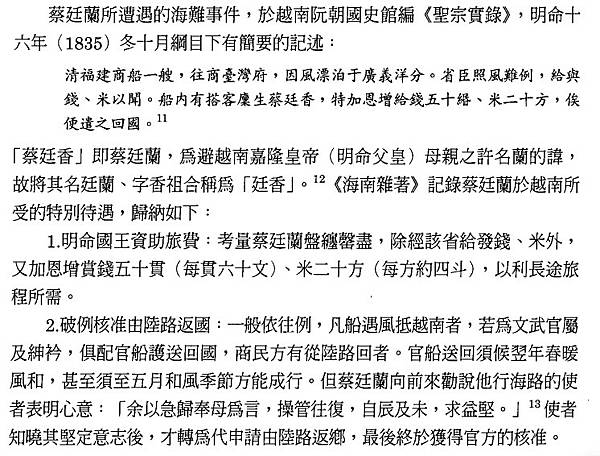 「漂流至越南時,越南正值最後一個王朝阮朝的統治,當時統治阮朝的明命帝傾心漢化,不但在國內的諸多制度上皆採漢制,更曾立下大志,要把越南打造成跟清朝一樣的強國。阮朝時期,越南士大夫們自詡為中華文化的傳承者,是正統的「華」而非「夷」。在這種氛圍下,蔡廷蘭作為一個「正宗」、從「天朝」來的飽學之士,在越南就很吃得開」