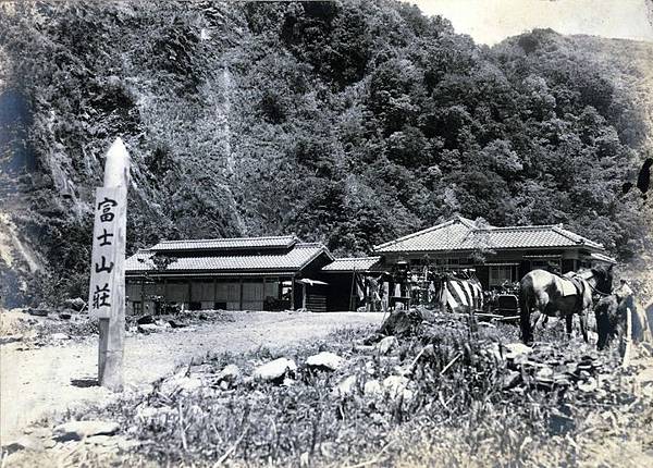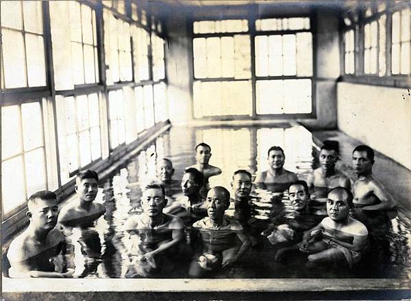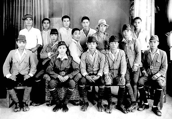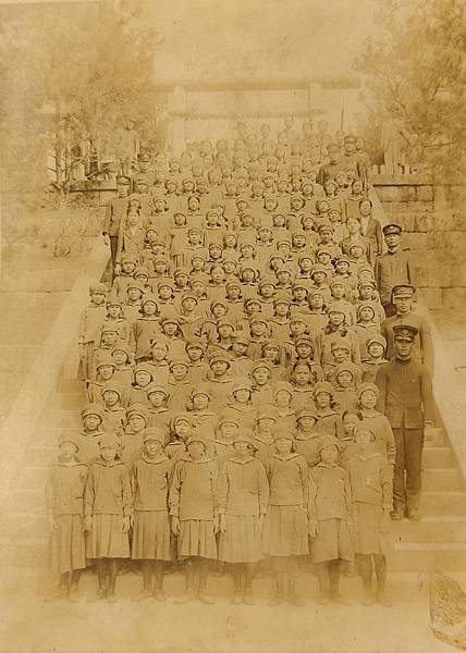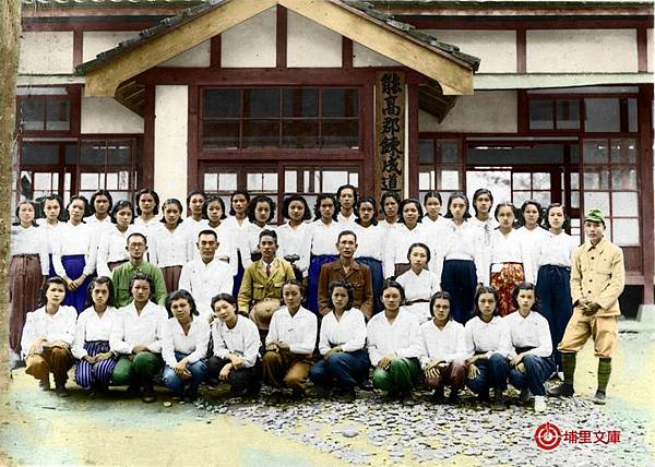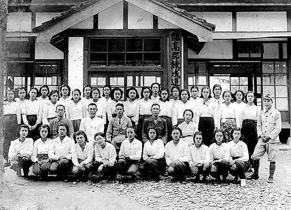 另一個由埔里未婚女性組成的「能高郡埔里街桔梗俱樂部」成員在「能高郡鍊成道場」訓練時合影,約攝於日昭和19年(西元1944年)。「能高郡鍊成道場」在今牛洞的埔里水源地內。