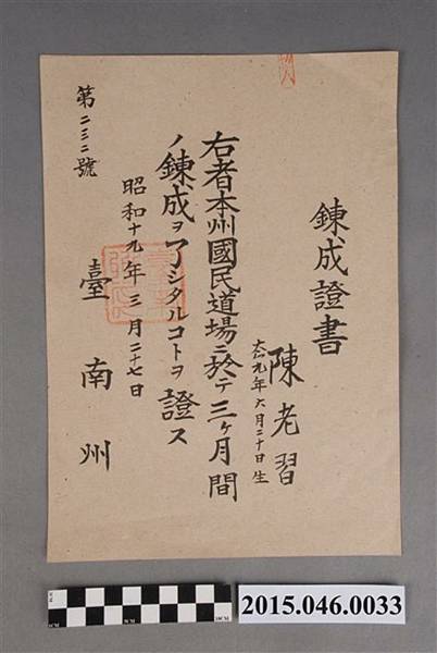 1944年陳老習先生於臺南州的國民道場(今台南市南區體育公園內)鍊成證書。「國民道場」為日治時期的皇民化運動 (1937~1945)下的產物,以軍旅的方式訓練臺灣年輕人擁有強健的體魄,也進行思想的洗禮,使臺灣人接受皇民的思想。 臺南州國民道場 - 維基百科,自由的百科全書