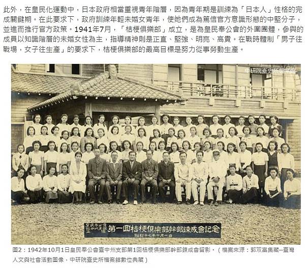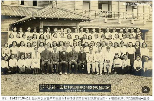 昭和17(1942)年10月1日,屬於皇民奉公會臺中州支部的桔梗俱樂部,舉行幹部鍊成(訓練)會。太平洋戰爭爆發後,皇民奉公會積極開始活動,除了男女青年團之外,還招募女生組織桔梗俱樂部,參與地方防衛活動。桔梗俱樂部幹部訓練 | 開放博物館 https://bit.ly/3x0wfZu