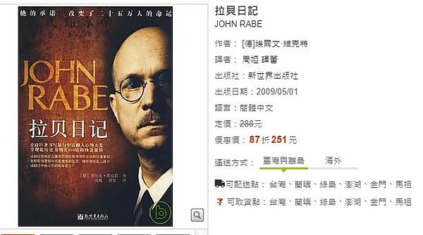 英譯《The Good Man of Nanking: The Diaries of John Rabe》,ISBN 0375701974, Vintage Books出版