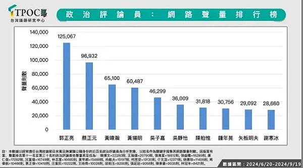 台灣政論節目與名嘴文化堪稱世界奇觀,各電視台甚至網路媒體都開政治評論節目,各自擁護不同立場,觀眾的熱情程度驚人,催生出許多知名時事評論員,且都擁有龐大粉絲族群支持收看收聽,人氣堪比藝人。不過,在眾多名嘴當中,究竟誰的網路聲量最高?影響力最大?根據TPOC台灣議題研究中心透過QuickseeK快析輿情資料庫,蒐集政論節目來賓們的網路聲量數據,近3個月的網路聲量表現,前立委郭正亮以12.5萬則總聲量奪冠,排名第二、第三的分別為前立委蔡正元和資深媒體人黃暐瀚。