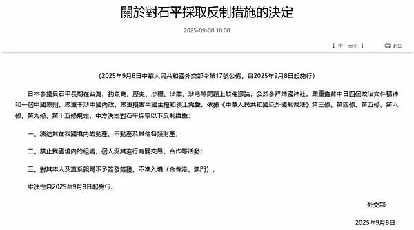 中國外交部公布制裁石平的理由,並祭出了三大反制措施。(圖/翻攝自中國外交部)