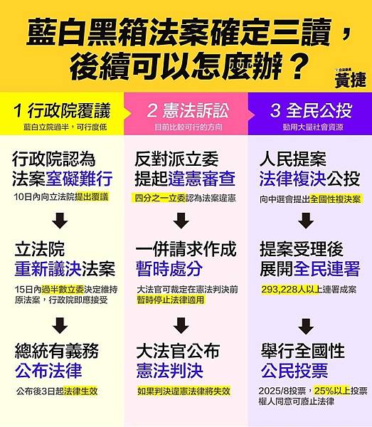 很多人不了解國民黨想通過的法案,以為只是單純的藍綠對決。不要小看這件事,當初香港就是由一群親中的民代通過這種不合理的法案開始沈淪的,當時民眾不滿只是罵一罵,等到人民發現修法不可逆時,他們開始上街頭抗議,那時候已經來不及了。大家要思考為何傅崐萁赴中後回台要修法?實質上利用國會過半,強行通過擴權法案,控制台灣主權,甚至不惜黑箱作業,沒有對外公開,也沒有討論程序就想強行通過,黑箱作業裡面的條文到底還打包了些什麼不敢公開的秘密?這些法律都是損害到台灣民眾權益的事才短短三個月就動作連連,真的不得不說傅崐萁等人這些立法委員好大的官威啊… https://bit.ly/4dQOu45 立院二讀官員不可反質詢 綠委憂「當初香港就是這樣開始沉淪」 https://bit.ly/3VgvUdt