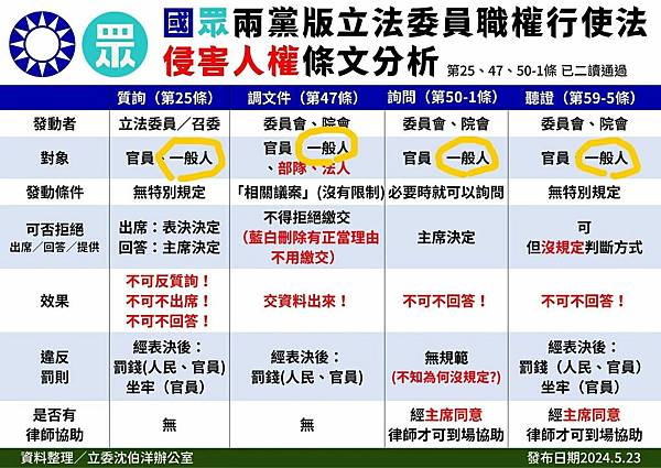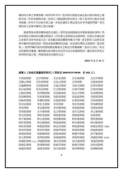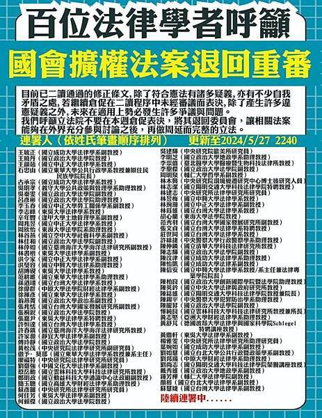 「國會5法」39位法律學者發布聯合聲明對於人民與官員基本權利的過度侵害,將造成憲政體制的混亂-呼籲立院不要在本週倉促表決,要求立院應將「國會五法」有涉及限制人民權利者,必須符合憲法上比例原則、法律明確性原則及正當法律程序之要求-應退回至委員會充分討論,並廣諮相關領域專家學者與社會各界意見 「國會5法」應退回委員會審議 https://bit.ly/44WjThq