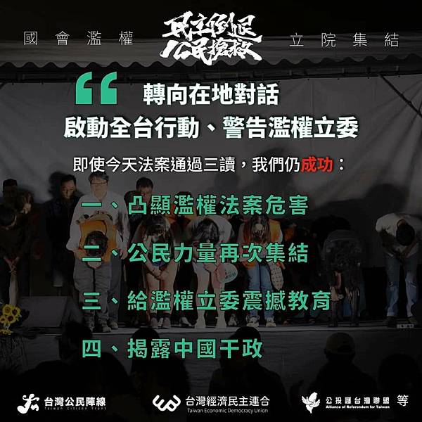 社會運動開啟,公投護台灣聯盟、台灣公民陣線、經濟民主連合等團體,明天5/21晚上6時30分,在立法院前發起「民主倒退,公民搶救,立院集結—阻止國會濫權法案三讀」,號召民眾前來聲援 https://bit.ly/3ys4xFs