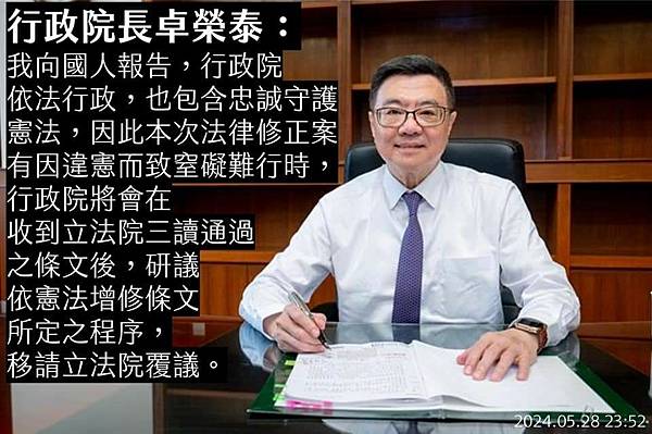 2024/6/6 11:17(6/6 14:30 更新)政院對國會職權修法提覆議 7理由認定窒礙難行 | 政治 | 中央社 CNA https://bit.ly/3VuOLTc