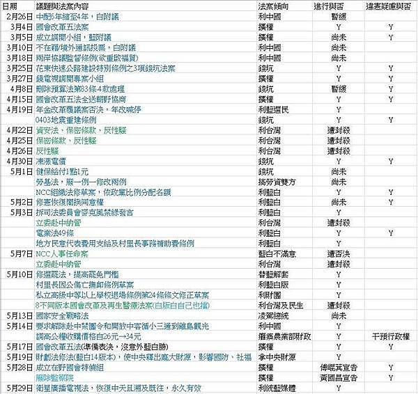 新科國會還不到一年,就發生許多前所未有的亂象,數個如同服貿般的複雜爭議法案,在更短的時間內,一件件橫柴入灶宣讀通過。