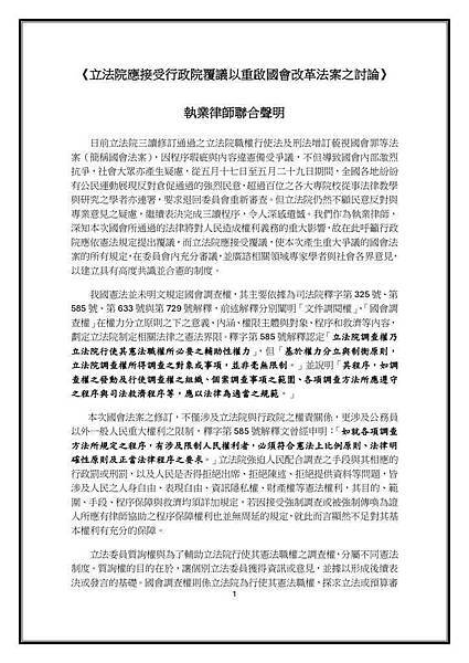我相信國會改革是全民共識,但有很多方法是更適合、更符合憲法的立法模式,尤其在社會爭議如此大的現在,此時更應該要停下腳步好好溝通審視,才能達成一個和解共好的台灣。