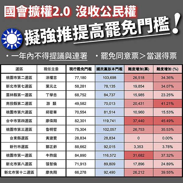 幾個月前,藍、白的國會擴權法案被憲法法庭判決違憲、人民也號召罷免擴權立委,而這次藍、白修法提高罷免門檻、實質癱瘓憲法法庭的「憲訴法」及「選罷法」,就是為了剷除擴權、亂政行為的後顧之憂,逃避作為立法委員所應承擔的政治、法律責任的自肥行為。