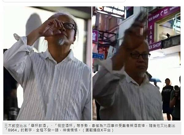 綜合外媒報導,昨(3日)晚9點20分左右,行為藝術家三木現身香港銅鑼灣東角道商圈,當街對空比出「舉杯飲酒」、「倒空酒杯」等手勢,象徵為六四事件受難者祭酒哀悼,隨後他又比劃出「8964」的數字。三木神情惆悵,僅管全程不發一語,但仍吸引不少人圍觀拍照。