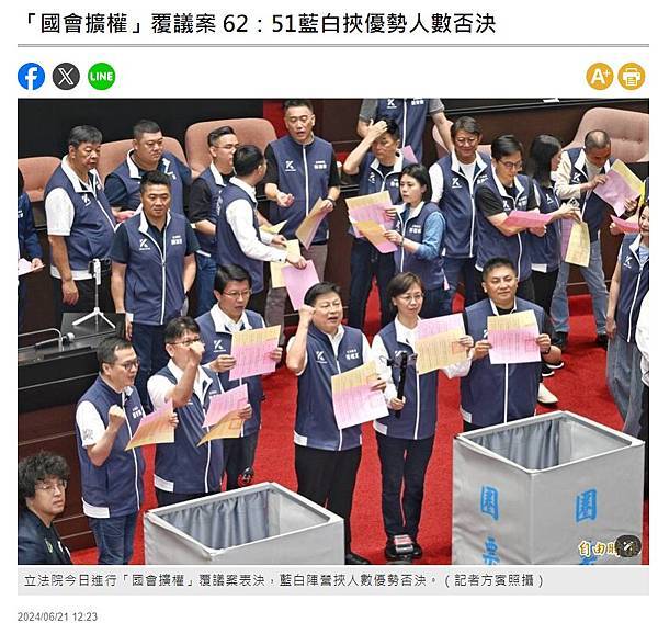 「國會擴權」覆議案 62:51藍白挾優勢人數否決 - 政治 - 自由時報電子報