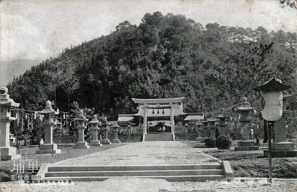 圖為埔里「能高神社」的明信片影像,為「臺中の春宵寫真部」約於日昭和15年(1940年)間攝影印製發行的,這一張是以比較廣角的方式,拍下能高神社的神殿一景,正殿前也有一座較小一點的明神鳥居,參道兩旁有很多各界獻納的石燈籠。整個虎頭山漂亮的山形下方,能高神社的正殿正好居中而立(今已被改建成國立埔里高工的大禮堂) ,座東向西,每天埔里的朝陽就是從這個正殿後方山頭升起,照耀整個埔里盆地。正殿正後方的山頂隱約還可見階梯及最早蓋在山上的「能高社」的小鳥居。埔里鎮立圖書館:埔里藝站 https://bit.ly/3UZkZV5