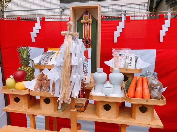 可以看到神職人已經為我們準備好了供奉的水果蔬菜,清酒,驅邪的食鹽和潔淨的大米:準備就緒
