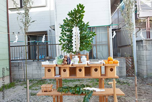 人們在該空間設置一個“Himorogi”以進行儀式,並由神道教牧師祝福這片土地並獲得土地守護神的許可。 [2] [4]