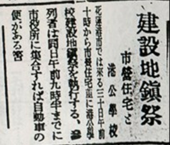 此影像為東臺灣新報於1941年(昭和16年)3月28日以「建設地鎮祭」為題,副標以「市營住宅與港公學校」進行了報導。根據此報導的記述可得知由市役所當局為了港公學校以及市營住宅的營造辦理建設地鎮祭。地鎮祭是日本營繕組織在開工時祭拜該地土地神明,以及祈求工程安全順利、建築穩固之祭典儀式。由市役所建設市營住宅的面向可以理解,花蓮港市的都市發展下,必須處理勞動力流入後的住宅需求。此影像掃描自東臺灣研究會的複印本,以中文摘錄日文報導標題及內文重點。建設地鎮祭-時空旅行社|國家文化記憶庫2.0線上策展平臺 https://bit.ly/3yEx36S
