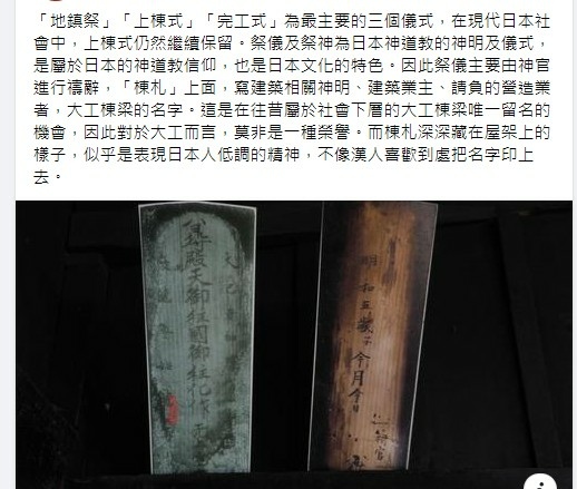 「地鎮祭」「上棟式」「完工式」為最主要的三個儀式,在現代日本社會中,上棟式仍然繼續保留。祭儀及祭神為日本神道教的神明及儀式,是屬於日本的神道教信仰,也是日本文化的特色。因此祭儀主要由神官進行禱辭,「棟札」上面,寫建築相關神明、建築業主、請負的營造業者,大工棟梁的名字。這是在往昔屬於社會下層的大工棟梁唯一留名的機會,因此對於大工而言,莫非是一種榮譽。而棟札深深藏在屋架上的樣子,似乎是表現日本人低調的精神,不像漢人喜歡到處把名字印上去。 「地鎮祭」「上棟式」「完工式」為最主要的三個儀式,在現代日本社會中,上棟式仍然繼續保留。祭儀及祭神為日本神道教的神明及儀... | Facebook https://bit.ly/3VjT8QT
