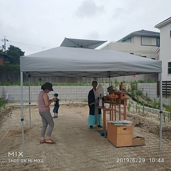 本來儀式本身我們並不擔心會有什麼意外的事情發生。是這一週的天氣預報總是雷雨和陰雨不斷。於是家人都很擔心週六的地鎮祭儀式時的天氣,從週一開始每天都在手機查閱天氣情況。還好到了地鎮祭舉行的週六這天,天公作美在早上11點儀式開始前雨停下。我們抵達土地時,神職人也為了以防萬一搭好了臨時擋風遮雨的帳篷。