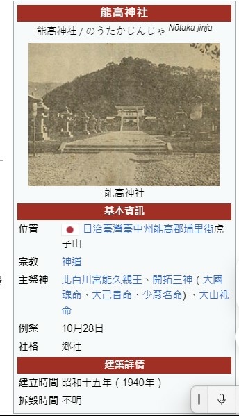 昭和14年(1939)1月27日,能高神社造營事業大鳥居2座完成。本殿建設地鎮祭執行。臺中神社櫻木清臣社司、委員長神田利吉郡守、副委員長兩課長、氏子總代、埔里街長、國姓庄長、造營委員代表、工事關係者順序玉串奉奠。