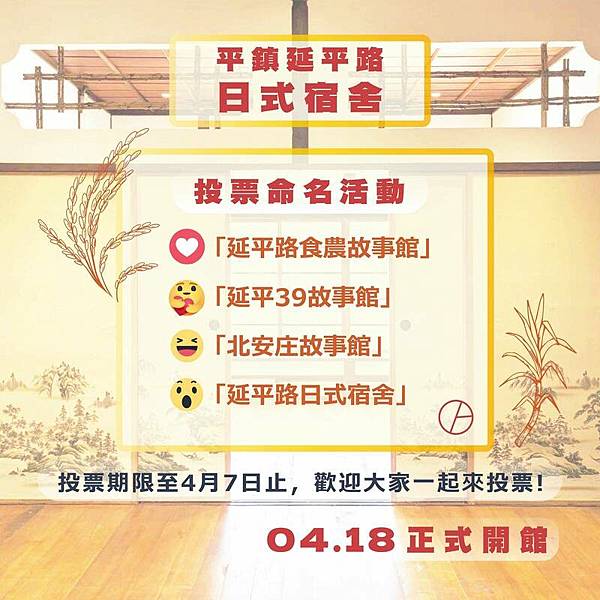 文化局發想「延平路食農故事館」、「延平39故事館」、「北安庄故事館」及「延平路日式宿舍」等四個名稱邀請民眾票選;只要至臉書搜尋「藝遊桃園」至文化局臉書粉絲專頁即可進行票選活動,文化局將參考民眾投票結果擇定館舍名稱,凡投票給最終定案館舍名稱民眾,就有機會抽中延平路日式宿舍餐廳「食寓」餐券,共有5個名額,投票期限至4月7日止。