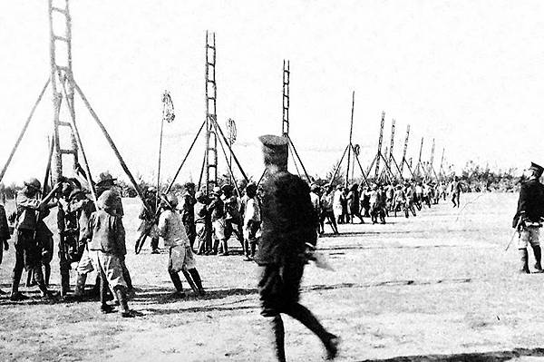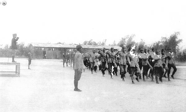 日治太平洋戰爭期間,政府徵招臺灣青年壯丁服役,特別志願兵、軍屬、軍佚、或組織所謂「臺灣義勇隊」開赴戰場前線之外,在國內即有青少年團、婦女會、壯丁團、警防團等組織,動員全民接受訓練,參與戰爭行列。照片為臺中市警防團在四張犁國民學校(今四張犁國民小學)校庭集訓團員情形。