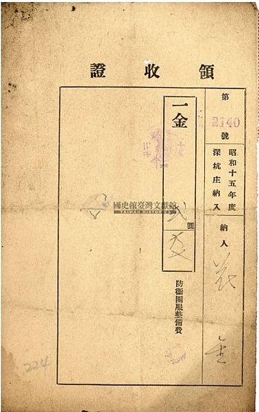 本物件為西元1940年(昭和15年)度深坑庄納入防衛團服整備費,經花金1金2圓40錢後,所取得的開立證明