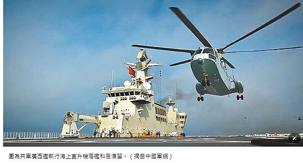 圖為共軍廣西艦執行海上直升機落艦科目演習。(摘自中國軍網)