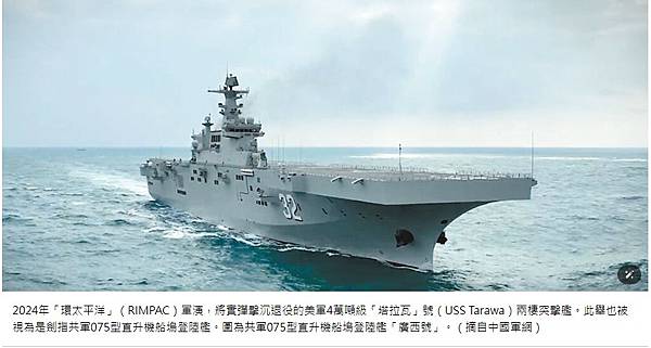 華府智庫「戰略暨國際研究中心」(CSIS)高級研究員費雪(Richard Fisher)表示,中國現在有8艘2萬噸以上、具備大型登陸平台的兩棲突擊艦,並正在裝備第四艘4萬噸級的直升機船塢登陸艦(LHD)。塔拉瓦號大小與中國的LHD大致相同。能迅速擊沉075型LHD,是2024年環太軍演要向北京傳達的核心訊息。